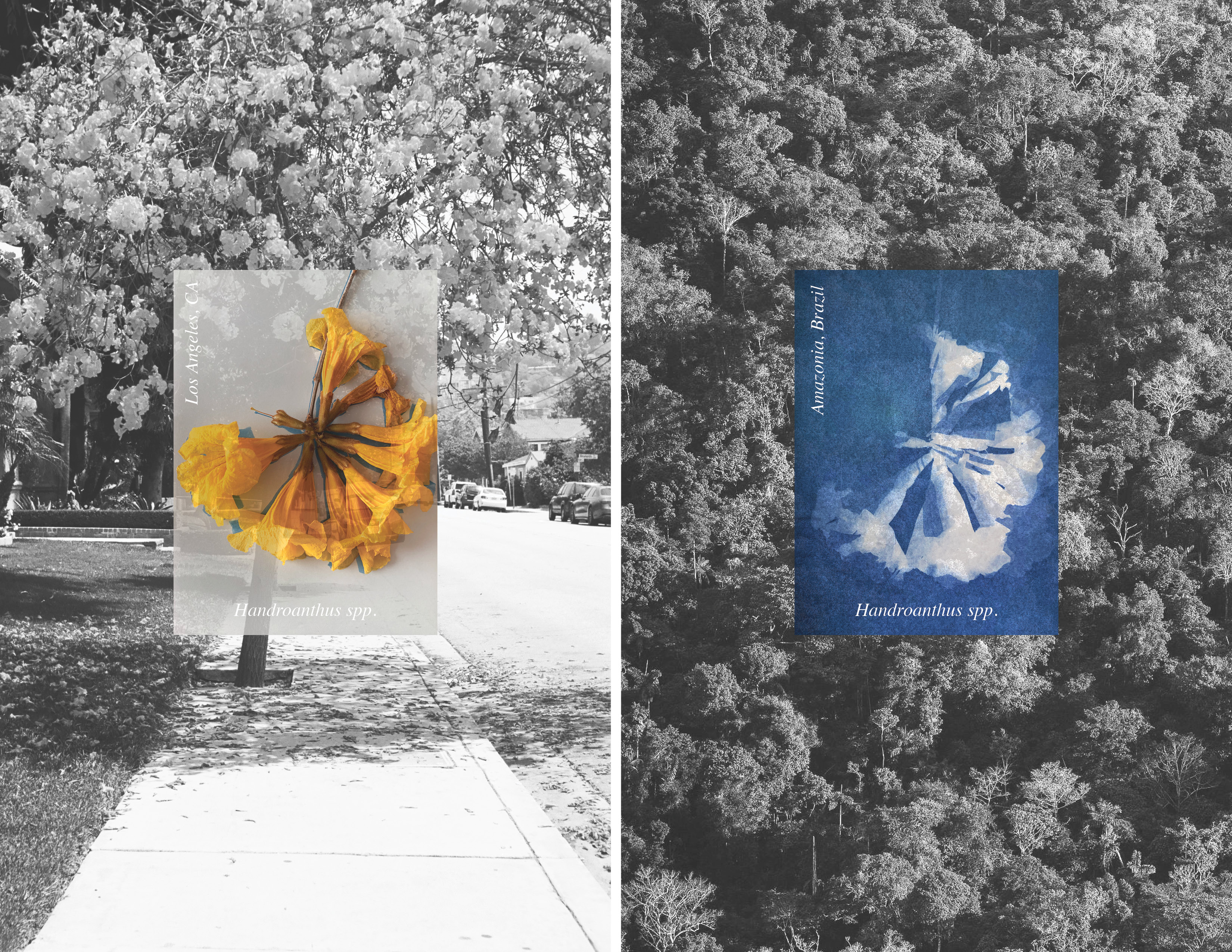 This diptych juxtaposes not just stories of two cities, but of two territories: Los Angeles, where trumpet trees stand in beauty, and the Amazonian Forest, where the same tree fuels one of the world’s most violent and unsustainable timber economies. Together, these geographies illustrate how beauty in one place can be inseparably tied to degradation in another.