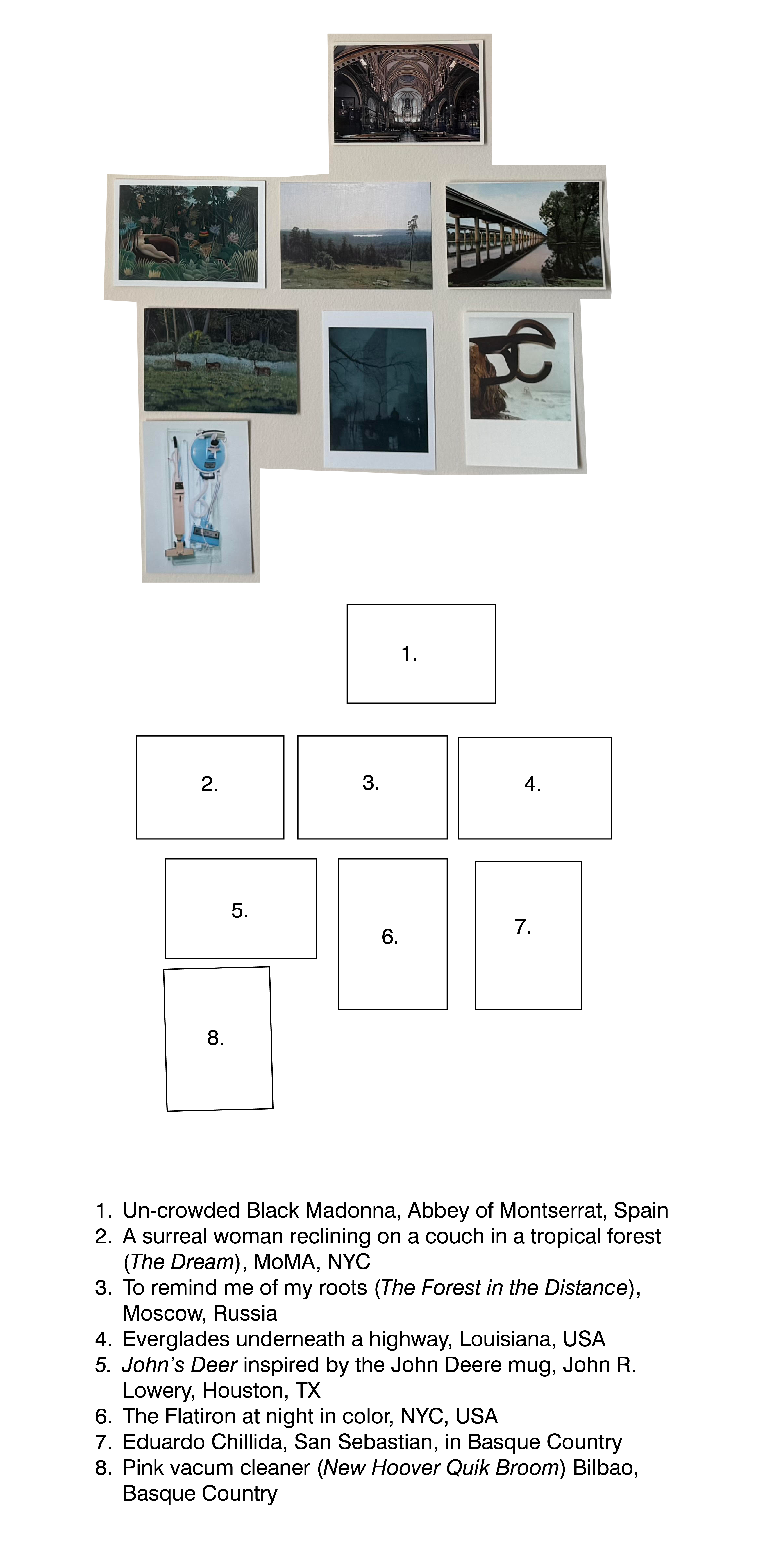 Arranged by color, not geography, the cards spark unexpected connections across distant times and places. As the images fade, their differences dissolve, leaving threads of memory, migration, and serendipity. This isn’t a map, but a constellation of lived experience—disparate moments and landscapes leaning toward one another, stitching a shared fabric of human presence across distance and time.
