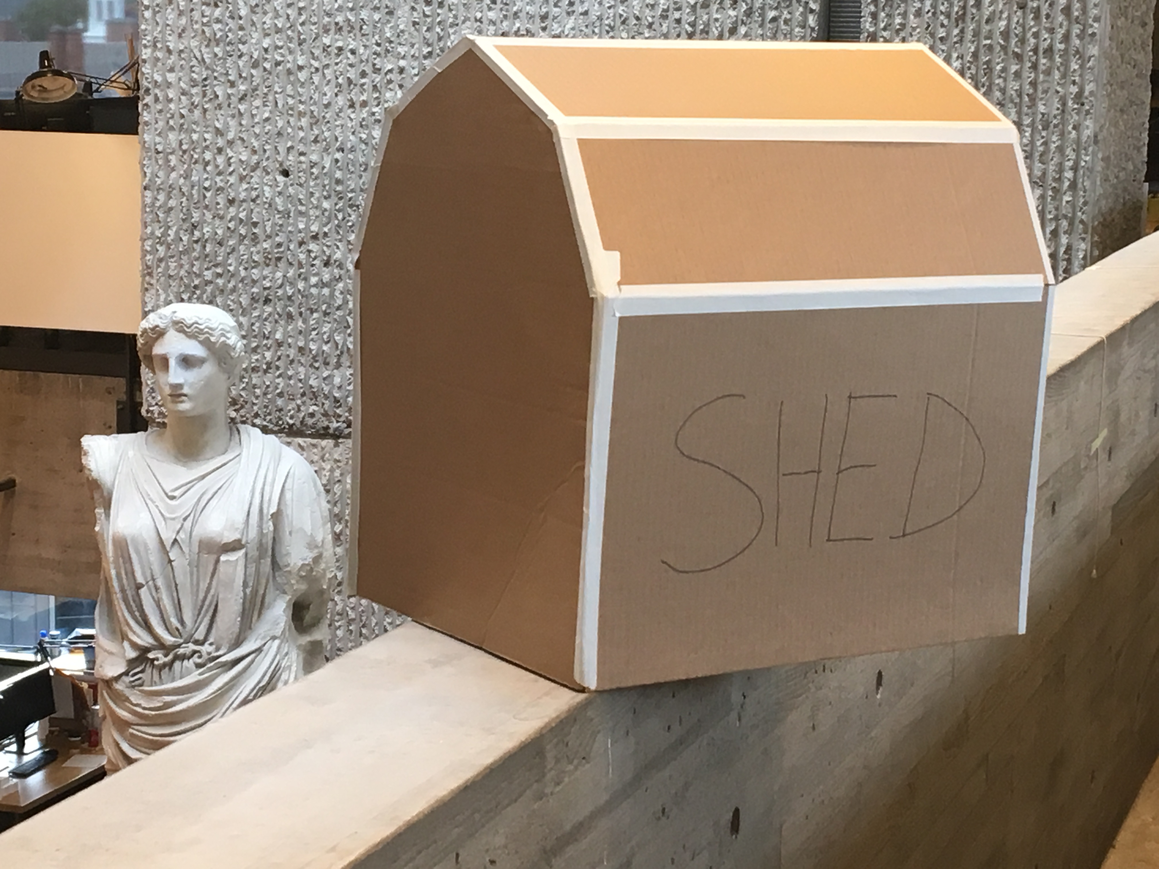 While you are the shed you have to keep a somewhat intrusively-large and ill-crafted cardboard shed at your studio desk.