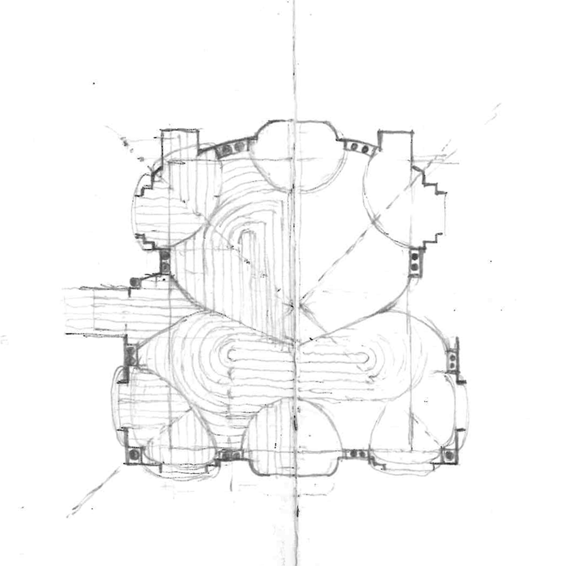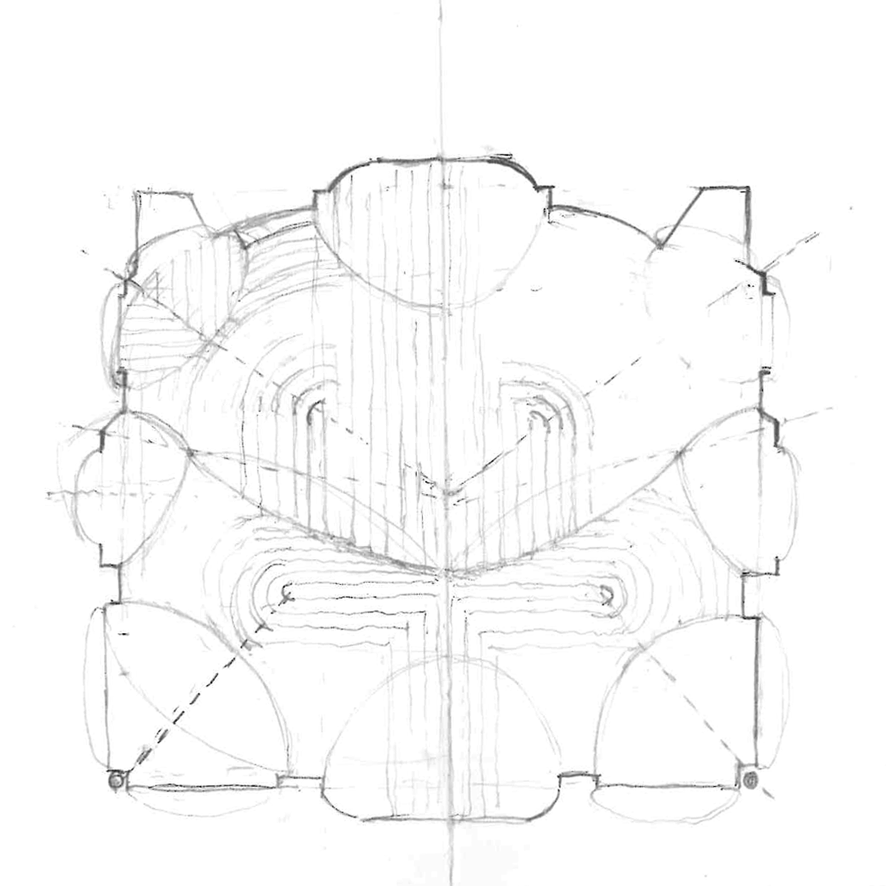 I returned the next morning to sketch the vaults and their patterns in plan, attempting to draw associations between geometry and the arrangement of the voussoirs (the landscape plan). As a group, we revisited the site again in the evening. This time, I counted the floor tiles and realized that the proportions in my sketch were incorrect and that the plan was rectangular. In the second sketch, I modified the plan’s proportions and the geometry of the vaults. Yet this also offsets the centers of the ceiling pattern from the centers of the vaults. The ambiguity between the optical and physical center creates an elongation of perception which is an estrangement that becomes a center of its own.