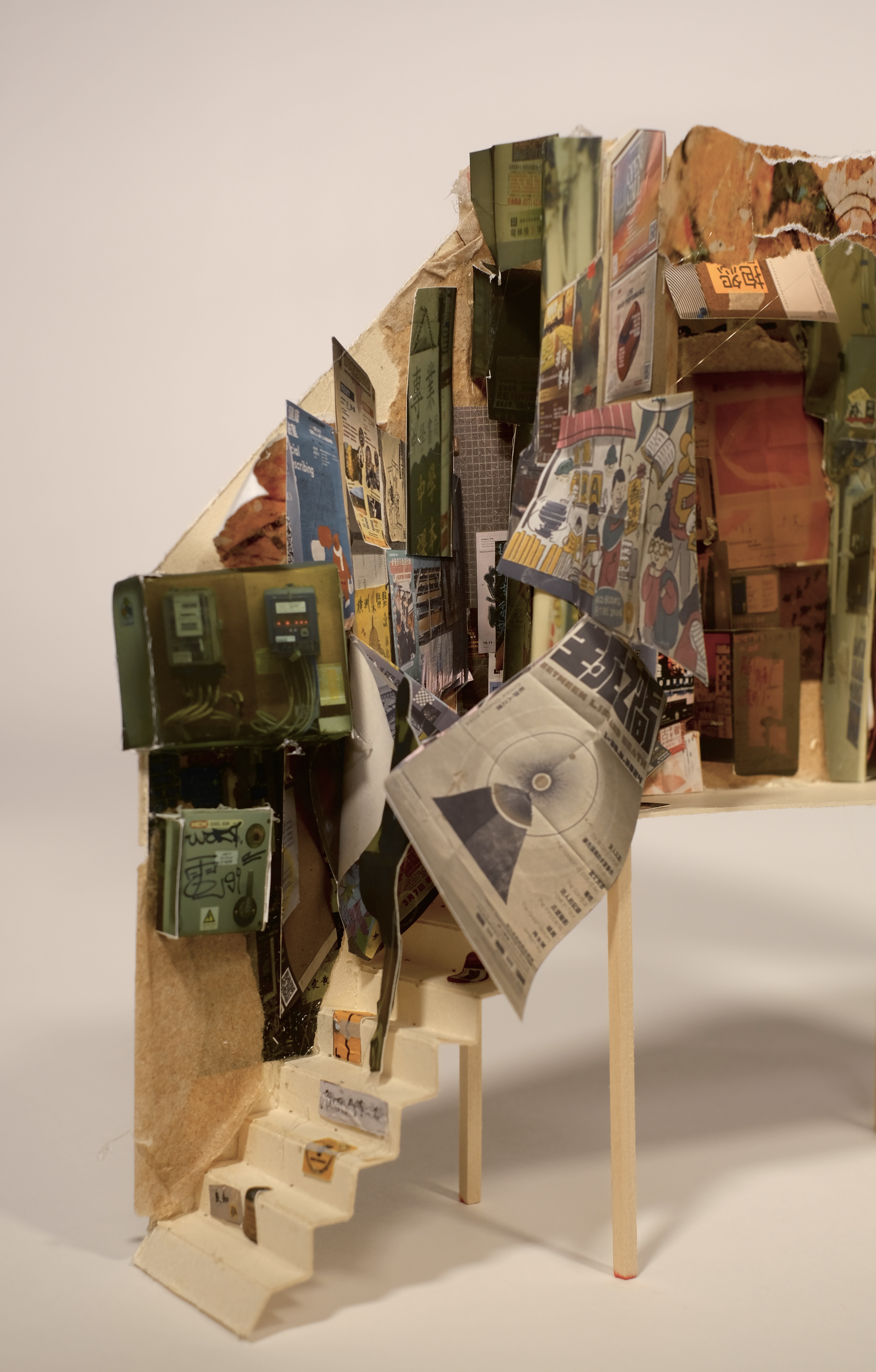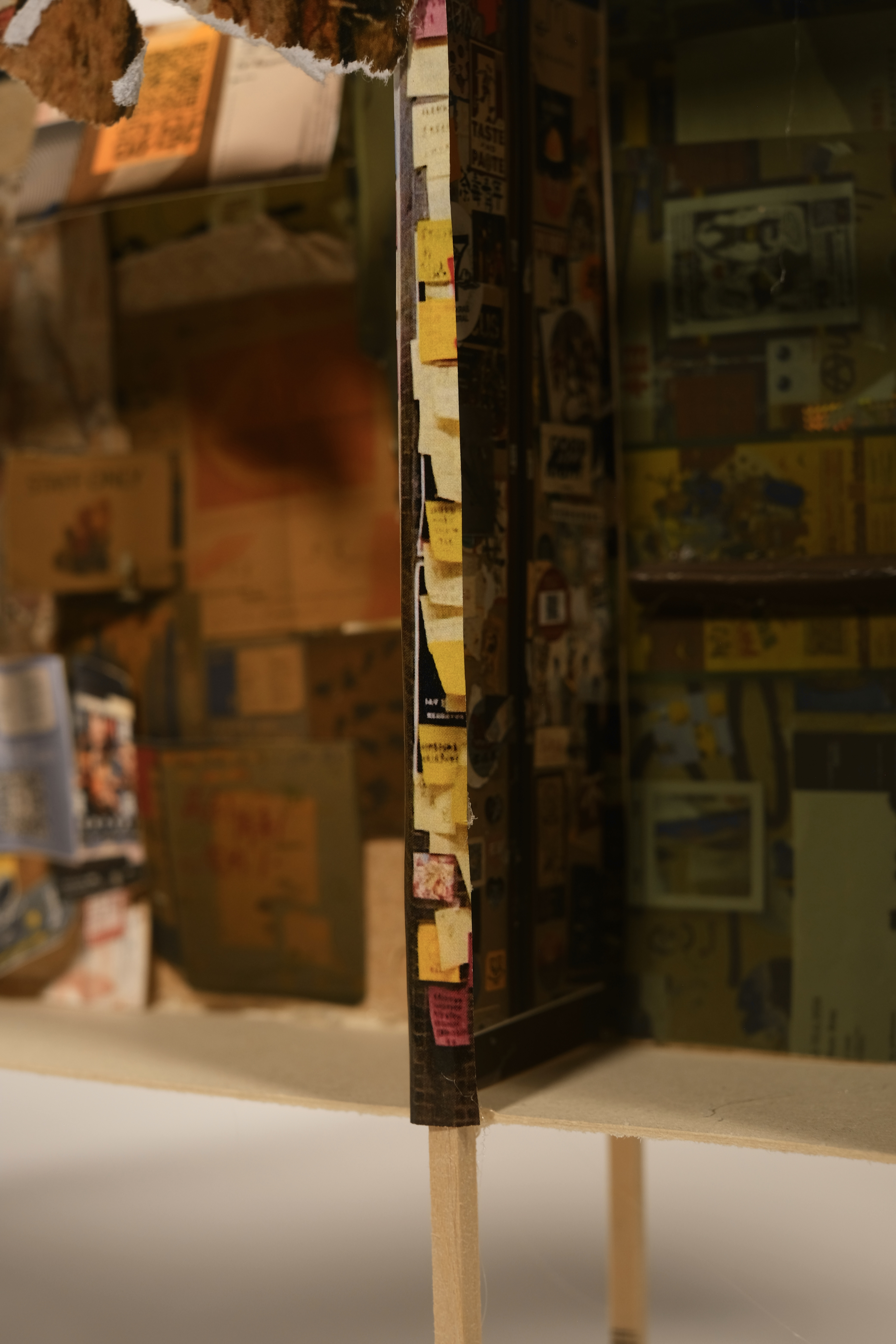To enter this hidden territory, one has to walk through the staircase to reach a retro elevator at the end of the hallway. The floor numbers blink one after the other as the elevator trembles to a sudden stop and opens to a beige interior – just enough space for two people to squeeze in. On every surface, layers of stickers ripped notes, and taped posters form a superimposed landscape of signs. The seemingly chaotic configuration of information has an inner temporal logic. Old messages are buried beneath the more recent ones. Words and images accrue uncanny links with each other as they overlay and juxtapose. A printed slogan “consciously observe the present reality” leads to a series of headless animals chasing after each other.